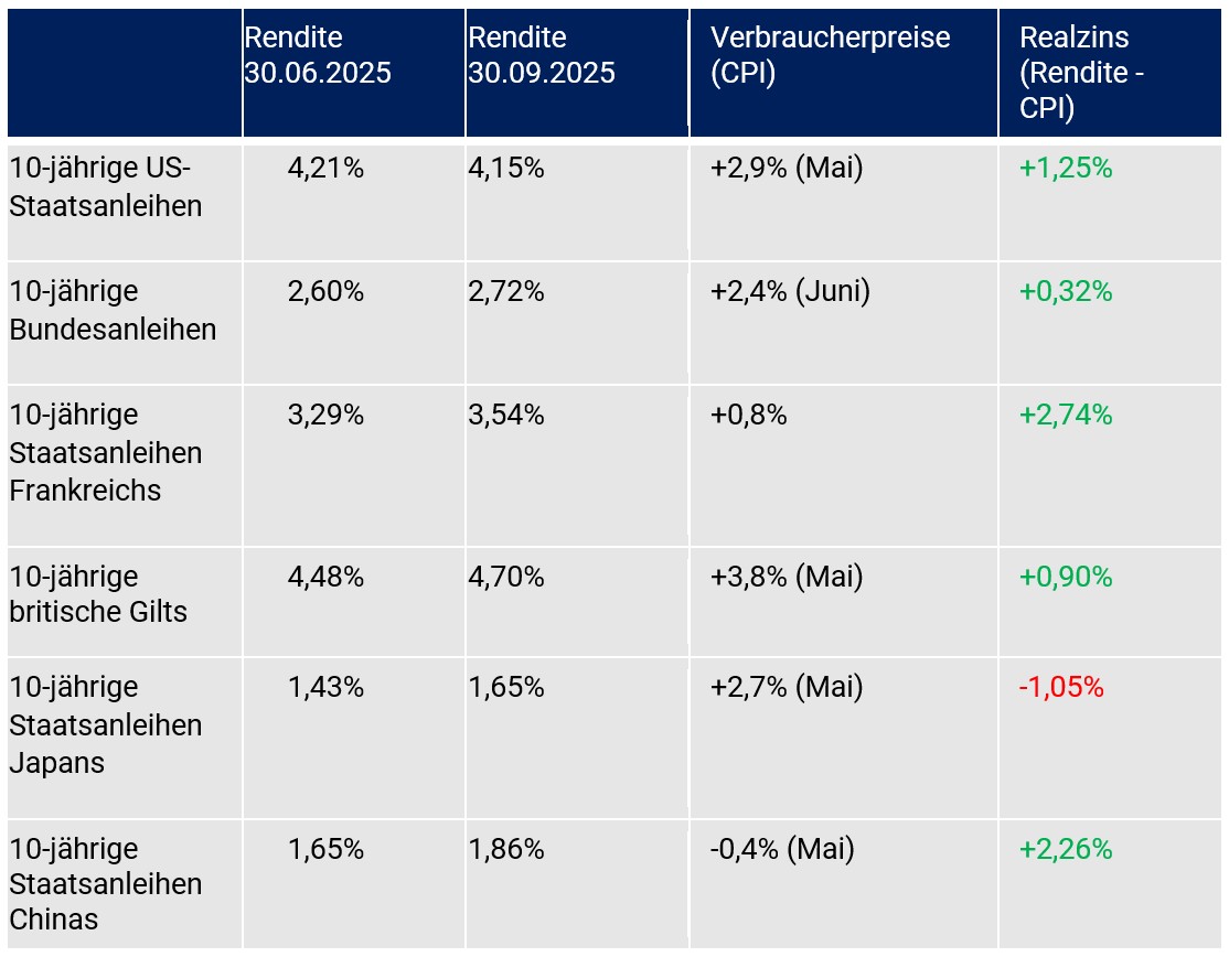 Das 3. Quartal 2025 war bezüglich der Zentralbankpolitik gekennzeichnet von einer Zinssenkung in den USA und dem UK um jeweils um 0,25 % auf 4,125 %, respektive 4,00 %. Die EZB pausierte im 3. Quartal in ihrem Zinssenkungszyklus (Anlagezins 2,00 %). Japans Notenbank verweigerte Zinserhöhungen (aktuell 0,50 %). In China wurden die Zinssätze für die „Loan Prime Rates“ trotz des Deflationsbilds unverändert belassen (1-jährige Kredite 3,00 %, 5-jährige Kredite 3,50 %).